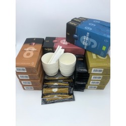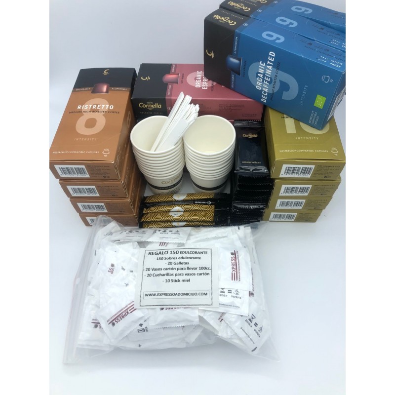 Pack recomendado para esas personas que quieren disfrutar de los diferentes tipos de café que disponemos a un solo clic y con todos los complementos gratuitos para que no falte de nada. Si te gusta el café solo y no quieres ningún acompañamiento gratuito, recuerda que puedes entrar aquí para escoger solamente las cápsulas.