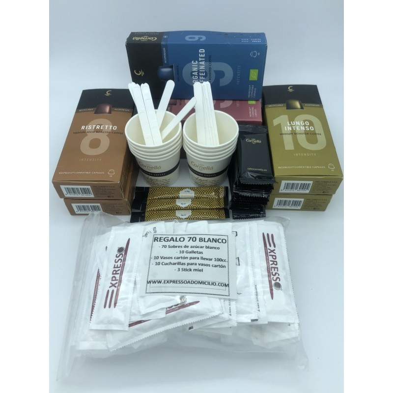 Pack recomendado para esas personas que quieren disfrutar de los diferentes tipos de café que disponemos a un solo clic y con todos los complementos gratuitos para que no falte de nada. Si te gusta el café solo y no quieres ningún acompañamiento gratuito, recuerda que puedes entrar aquí para escoger solamente las cápsulas.